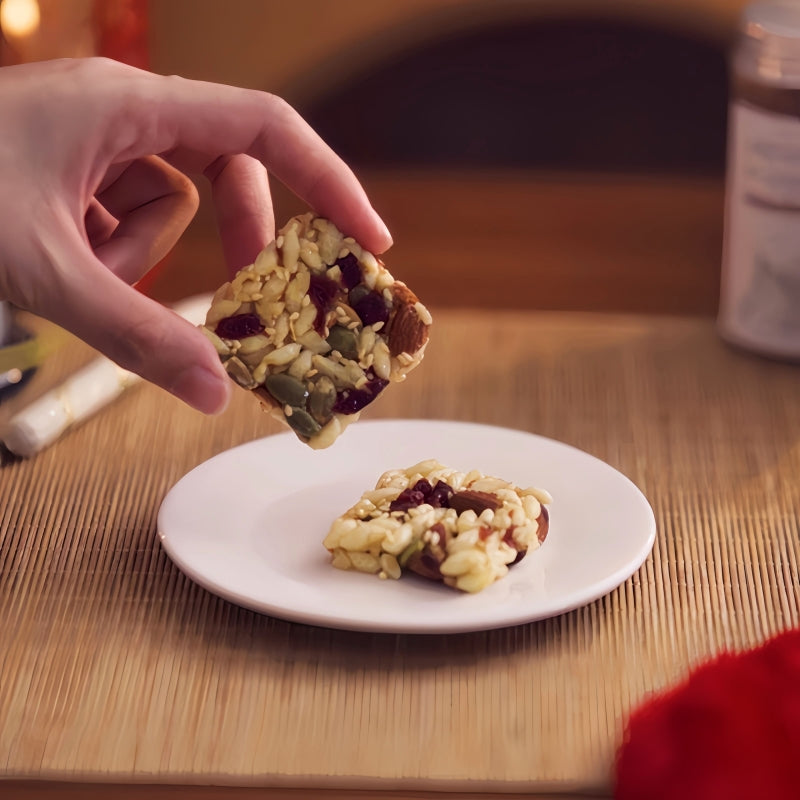 It's bake with Almond Nut ,Bubble Rice, Macadamia Nut,Cranberry, Green Pumpkin Seed, White Sesame, Maltose (replace white sugar) and Butter